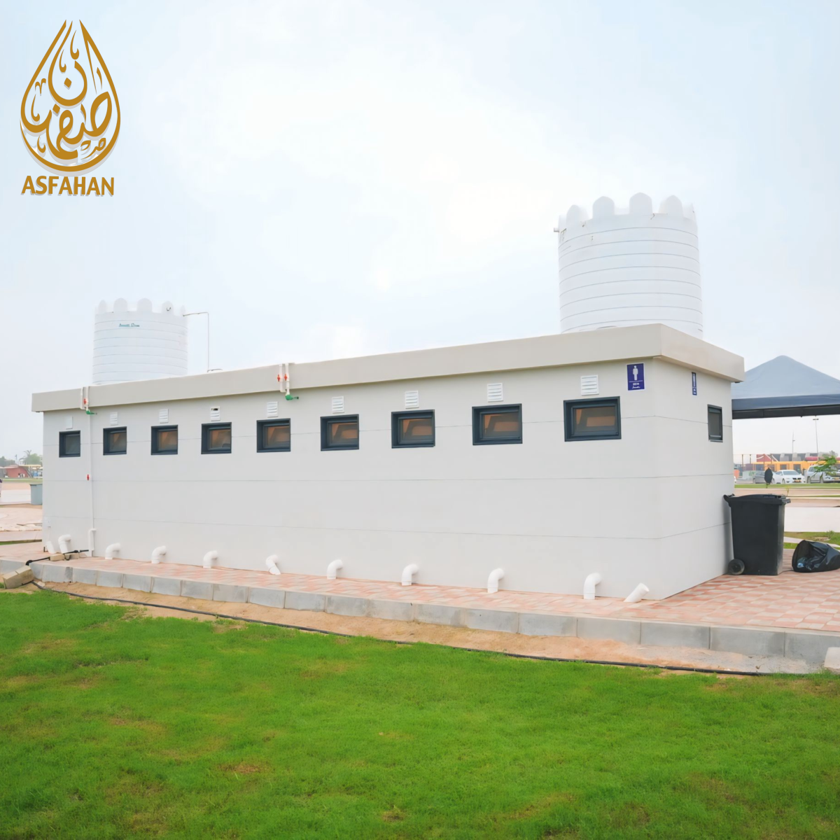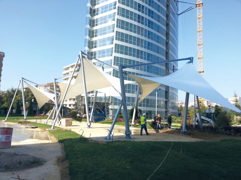 Fire-resistant tensile shade structures made with high-quality, heat-resistant fabric for reliable shelter. Custom designs to match the surrounding architecture and Omani style, with multiple color options. Frames are dip-galvanized steel for strong corrosion resistance.